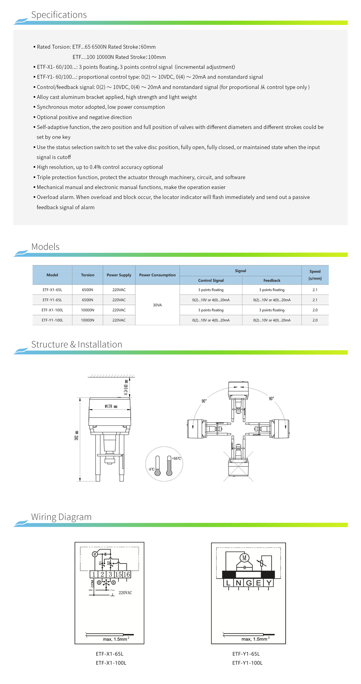 Van điện từ dòng ETF được ứng dụng trong hệ thống điều hòa không khí và hệ thống sưởi ấm. Độ mở của van được điều chỉnh theo tín hiệu dấu analog (DC 0/2~10V hoặc DC 4/0~20mA) từ PLC, DDC và bộ điều nhiệt để kiểm soát lưu lượng môi chất trong đường ống và đáp ứng việc kiểm soát chính xác lưu lượng, áp suất và nhiệt độ.