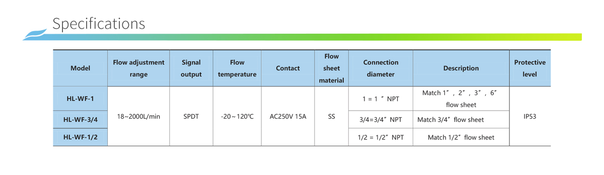 HL-WF Cảm biến lưu lượng là công tắc lưu lượng một cực hai vị trí (SPDT). Đầu ra của công tắc có tác động nhanh và độ chính xác cao. Giá trị lưu lượng được điều chỉnh bằng vít, rất đơn giản và tiện lợi. Nó được trang bị nhiều bộ phận điều chỉnh hướng dòng chảy để thích ứng với các yêu cầu về lưu lượng và đường kính ống khác nhau.