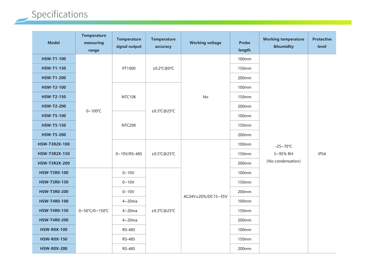 HSW Cảm biến nhiệt độ đường ống nước được sử dụng để đo nhiệt độ nước trong các đường ống nước trong hệ thống tự động hóa tòa nhà. Tín hiệu nhiệt độ có sẵn dưới dạng NTC10K, PT1000, điện áp và dòng điện. Các mẫu có giao tiếp RS-485 hỗ trợ giao thức Modbus, giúp việc tích hợp hệ thống dễ dàng hơn.